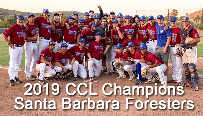 Christian Franklin (Arkansas) each doubled and had multiple-RBI games to lead the Santa Barbara Foresters to a 10-9 win over the Arroyo Seco Saints today at Sparky Anderson Field to claim the 2019 CCL Championship. Hall’s double with one out in the third inning sparked a three-run rally that put Santa Barbara up 7-0, and his home run in the fourth, which came on the heels of a two-run home run by