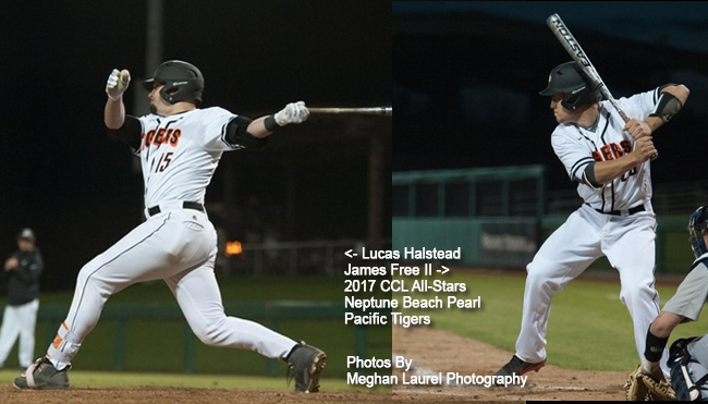 July 5, 2017 Oakland, CA James Free II (Pacific) and Lucas Halstead (Pacific) hit a pair of solo home runs each, going back-to-back with the tying and winning run with two outs in the bottom of the ninth inning to give the Neptune Beach Pearl a dramatic walk-off win over their North Division rival Healdsburg Prune Packers 6-5 today at Laney College. The back-to-back game changers were all the more dramatic because Healdsburg had scored four runs in their half of the ninth inning on only one hit, an RBI-double by Landon Etzel (Houston), to take a 5-4 lead. Trailing 4-1 going into the ninth, Sawyer Pittman (San Jose St) was hit by a pitch to put the leadoff hitter aboard. Etzel’s double then advanced Pittman to third, a sacrifice fly drove in Pittman, Esteban Martinez walked and he and Etzel scored when Bryce Nagata (Sonoma St) got aboard on a three-base error, and then Nagata scored on another sacrifice fly by Grant Little (Texas Tech) with what looked like would be the game-winning run for Healdsburg and a heart-breaking loss for Neptune Beach. Both teams have been trading places atop the CCL Standings as of late and so, when the first two batters in the bottom of the ninth inning were put out, it looked like Healdsburg would leapfrog the Pearl back into first place. But then Free hit a home run to tie the game, Halstead hit another and the game and the first place standing went to Neptune Beach in walk-off fashion. Halstead’s first home run to lead off the second inning opened the scoring for the Pearl and, after the Packers tied the score at 1-1 in the fifth when Reyes Fuentes (Houston) singled and scored on a Little two-out RBI, Neptune Beach again took the lead when Free hit his first home run to lead off the sixth. Zachary Miller (West Virginia) added an RBI-single in the sixth inning and Halstead singled home another run in the seventh to give Neptune Beach a 4-1 lead that would last until the ninth inning drama unfolded. Kevin Stone (Harvard) started on the mound for the Pearl, throwing seven innings of one-run ball with four strikeouts, and Alec Rennard (Michigan) started for Healdsburg, recording eight strikeouts in five innings, but neither figured in the decision. Click here for recaps of this game Elsewhere around the CCL today: Thousand Oaks, CA Evan Lee (Arkansas) threw six innings of shutout ball and the Santa Barbara Foresters scored eleven unanswered runs on their way to an 11-1 win over the Conejo Oaks today at Sparky Anderson Field. Lee, a true two-way baseball player who is in the top ten of the CCL leading hitters and was selected last night to represent the Foresters in the CCL All-Star game next week as an outfielder, struck out eight in his six-inning start today and allowed only five baserunners (three hits and two walks). And while Lee, who is also now the league leader in pitching with a 0.00 ERA in 15 total innings, was posting zeros on the scoreboard, the Foresters offense was posting crooked numbers. Santa Barbara scored four in one inning, three in another and two twice, collecting 15 hits as a team, to lead throughout. Zach Humphreys (TCU) started the scoring for the Foresters with an RBI-single in the second, followed by a sacrifice fly by Jimmy Galusky (West Virgina). David Clawson (BYU) hit a two-run home run in the third inning to make the score 4-0, Chandler Bengston (Columbia) hit a two-run single and Humphreys drove in another run with a single in the fifth to make it 7-0, Joey Fiske (St. Mary’s) hit a bases-loaded, two-out triple in the seventh and was driven in by the next batter, Hank LoForte (Cal St Fullerton), to make the score 11-0. The only blemish to the Foresters’ pitching line came in the ninth inning when the Oaks' Grant Mayeaux (San Diego St) got on base on a two-out error and scored on a Jordan McFarland (Arkansas) single. Fiske led all hitters with his three RBI and Humphreys and LoForte each finished with a game-high three hits. Max Weinstein (Cal Lutheran) doubled and singled, and Zayne Willems (Texas Tech) singled twice to highlight the Oaks. Conejo used seven pitchers in today’s game and the performance that stood out was Ty Harpenau (Texas Tech) who struck out the side in his only inning of work in the eighth. Click here for recaps of this game Long Beach, CA David Miranda (Florida Atlantic) hit a two-out, two-run triple in the first inning in what would prove to be the winning run as the Orange County Riptide beat the Long Beach Legends 4-1 today at Long Beach City College. The runs Miranda generated upped his league-leading total to 23 and gave Jordan Dosey, (UVA), Hunter Bigge (Harvard), Will Tomlinson (Brown) and Seth Jordan (Texas St), the four pitchers to see action on the mound today for the Riptide, all the run support they would need. In relief of Dosey, who started and went three innings, Bigge, Tomlinson and Jordan were close to perfect. Bigge, who relieved Dosey with no outs in the fourth after a run scored on the second double of the game for Daniel Zimmerman (Michigan), and a walk loaded the bases, struck out the first batter he faced and then induced an inning-ending double play to avoid further damage. He then retired six of the next eight batters, earning the win before turning pitching duties over to Tomlinson, who retired three in a row, and Jordan, who retired six in a row to close out the win and earn the save. Click here for recaps of this game San Luis Obispo, CA Blake Burton (Washington) hit a two-run double as part of the Arroyo Seco Saints four-runs scored before an out was recorded in the first inning, and Burton would go on to have a five-for-five night at the plate, but Justin Beck (San Jose St) would hit a couple of run-scoring doubles of his own as the San Luis Obispo Blues came back from the early deficit to beat the Saints 6-5. Click here for recaps of this game Oakland, CA Sam Curtis (William Jessup) had four RBI and four singles, Dave Campbell (San Lose St) drove in five on a two-run do